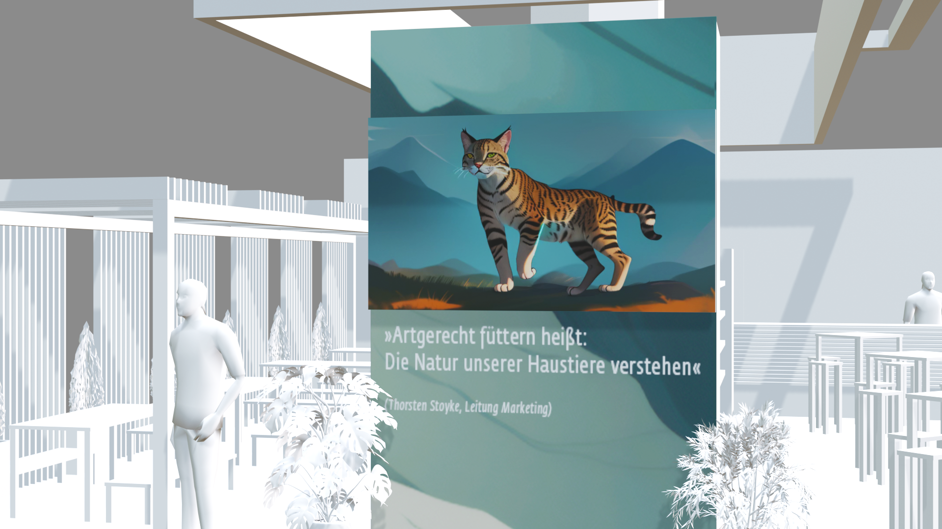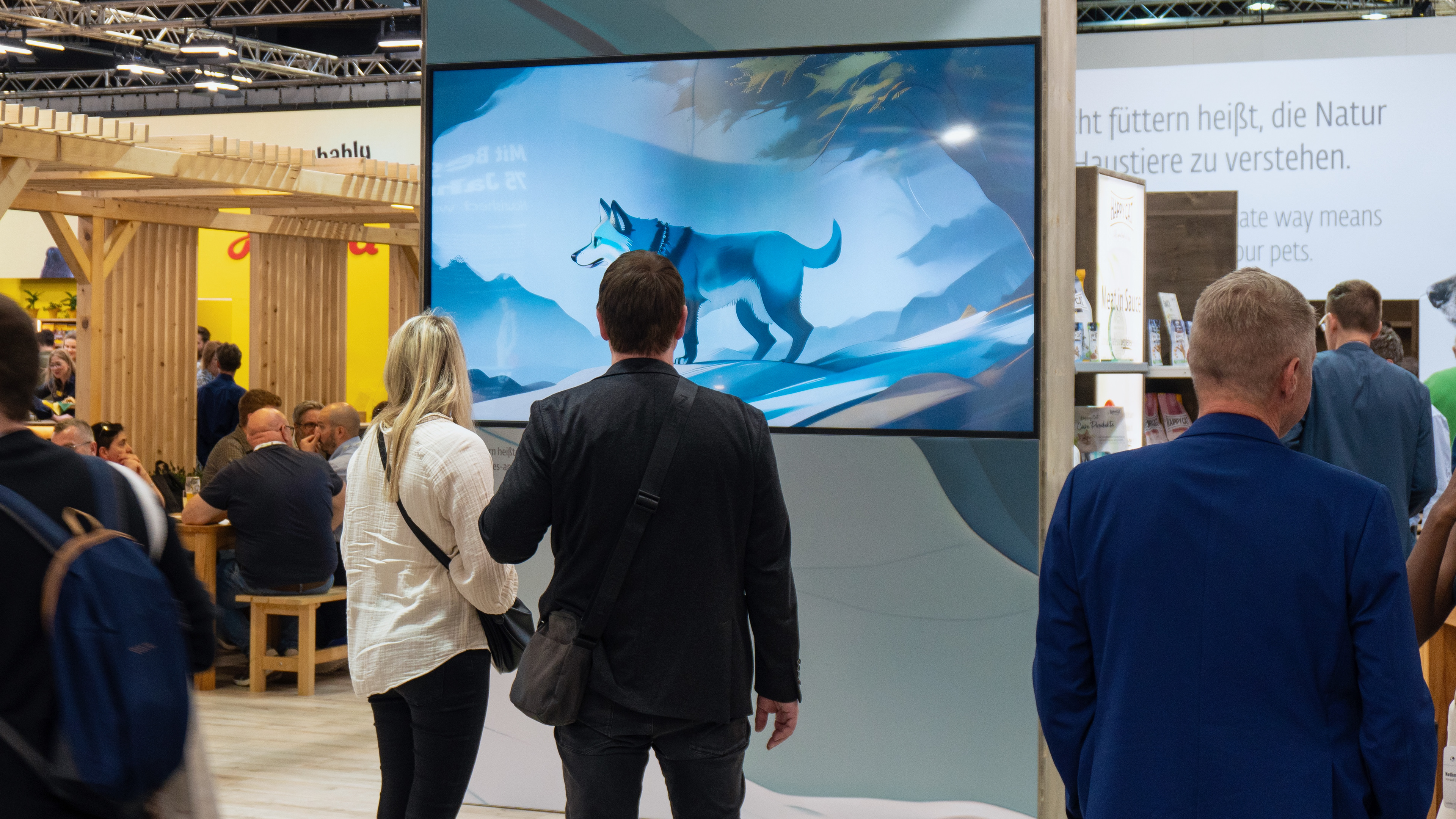 For their booth at the Interzoo 2024 trade fair, we developed an eye-catching motion design key visual that tells the story of the evolution of the pets. It includes sections on the hunting ancestors of our pets, the wolf and the miacis, sedentism and domestication, and our modern life with pets as an important part of our families. We also include the process of preparing fresh and organic products for consumption by animals.
