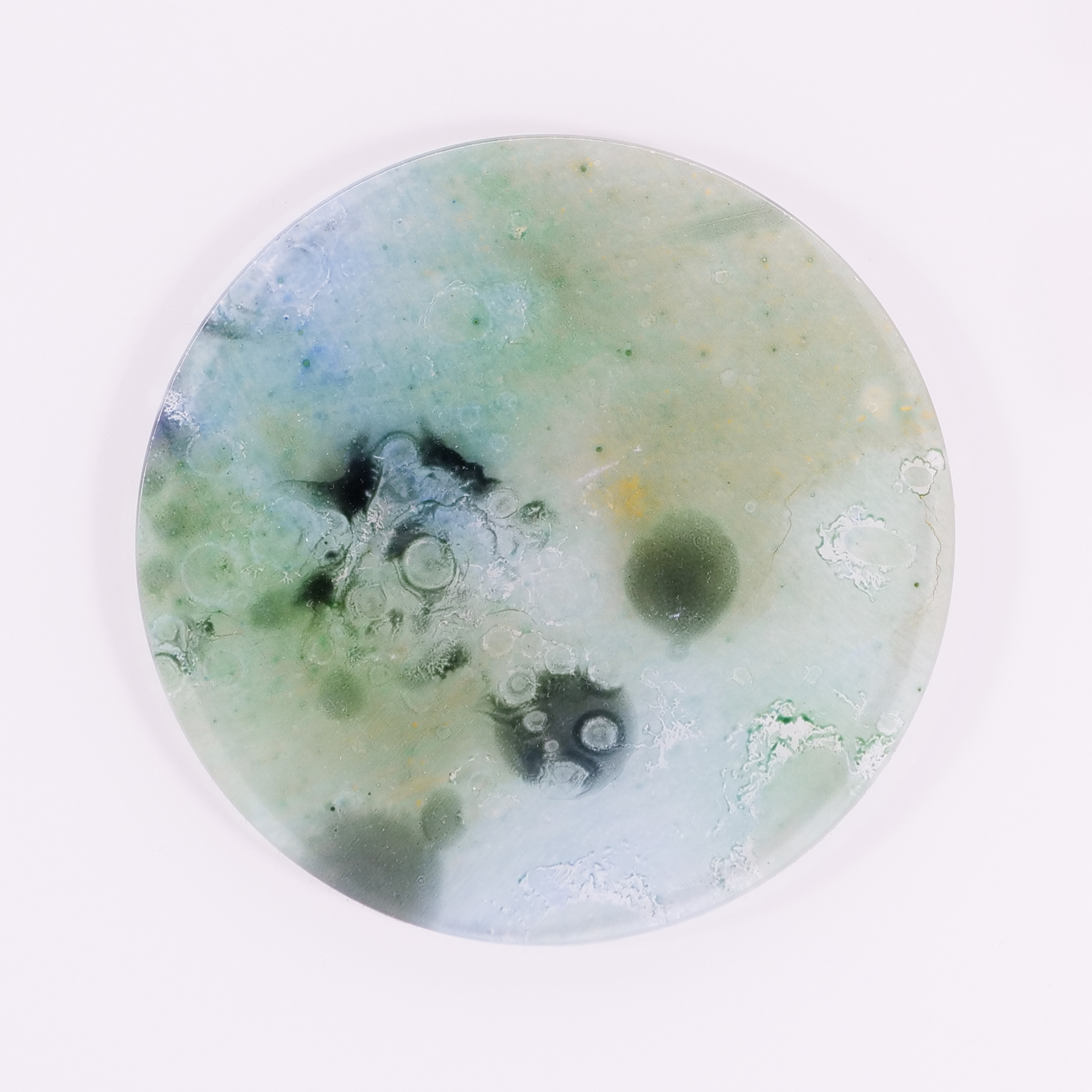 In the artwork »Bunte Reihe« we follow an analogous path: In glass painting, colors are mixed by combining different coloring substances with each other. However, the actual mixed color can only be seen after firing, when the materials have reacted with each other at high temperatures.