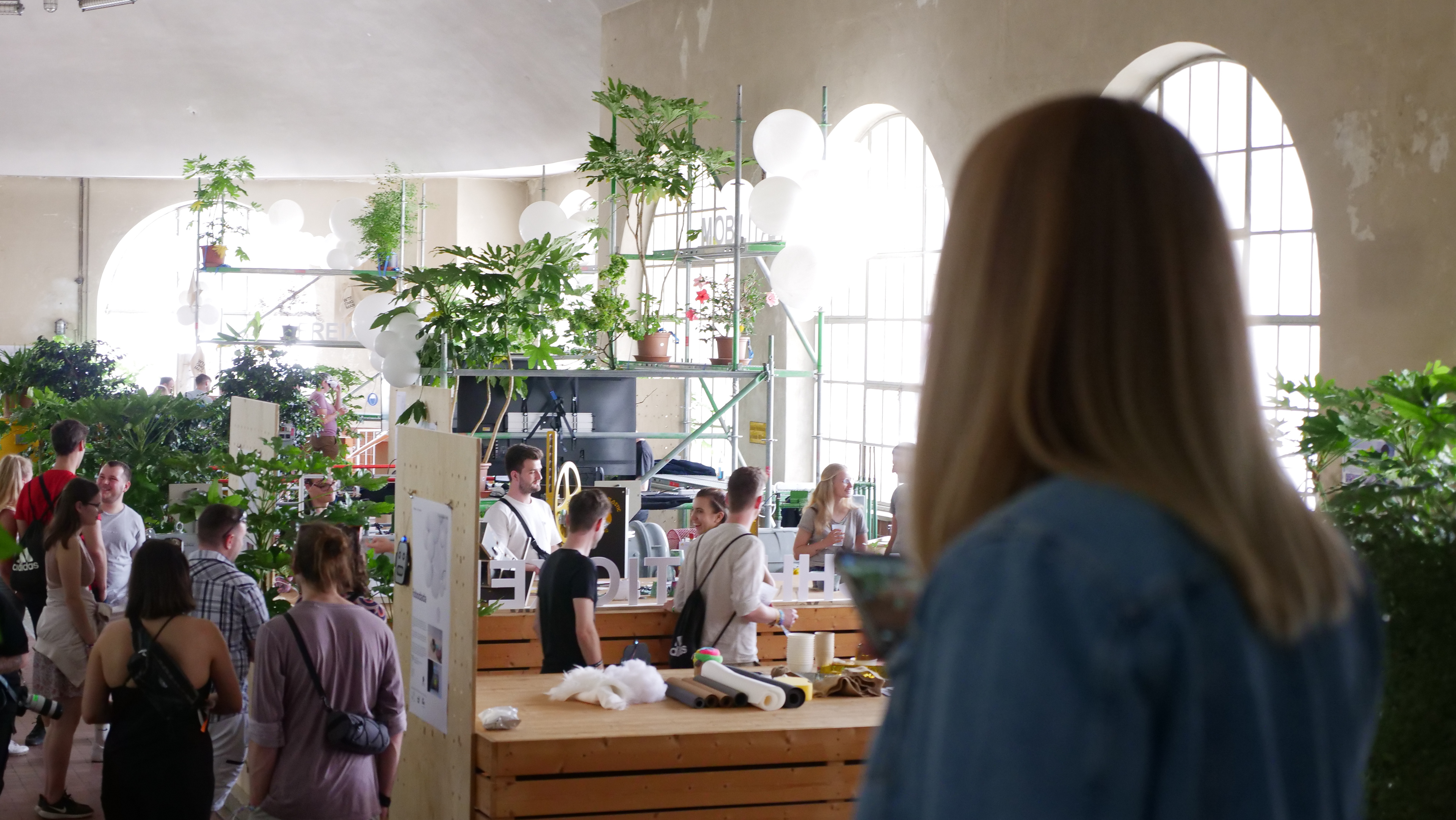 Integrated in a scenography of plants, scaffolding, glowing balloon clouds and typography, the festival visitors were inspired to enter into an exchange with students and teachers: the areas of sustainability, mobility, innovation, education, founding and culture were discussed on 900 square meters of exhibition space.